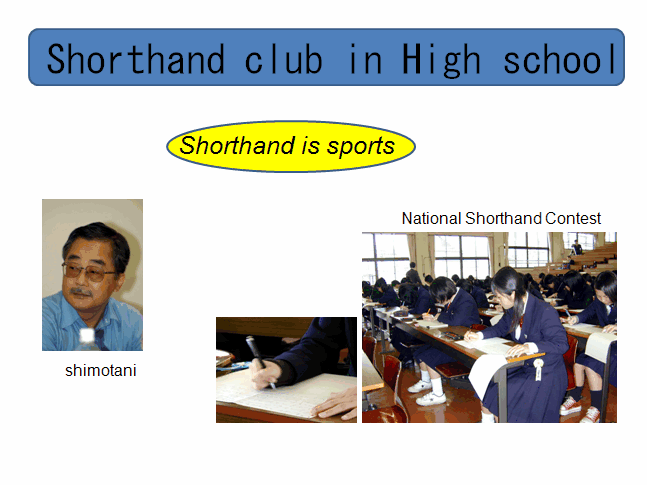 Now, 20 schools and 300 students. At peak, 400 schools and 500 students. Subjects: Are Social values enough ? Student (2)School (3)Benefit 7.Research and Development of Shorthand (1) Study of Coding and Decoding theory (2) Education theory in Shorthand skill building (3) New application fields of Shorthand (4) Shorthand Innovation (5) Increase of Added Value (6) Joint Working on International Standardization in the producing Verbatim Shorthand Record |