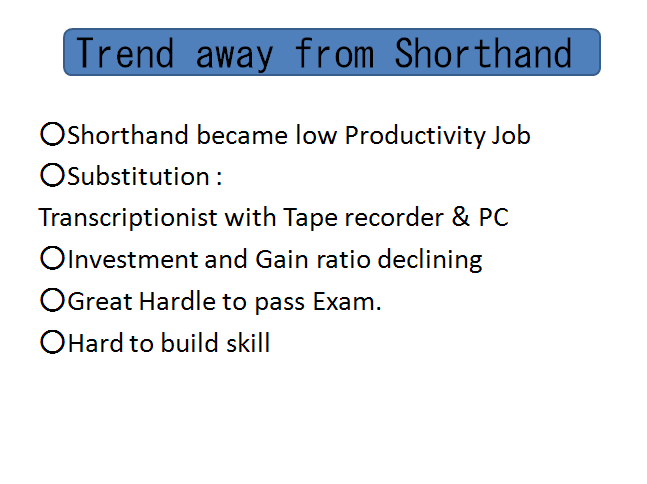 Substitute Industry, Overseas sift (out flow) of labor intensive industries. 2.Trend away from Shorthand Japan has been developed its economy in short term and became rich.On the other hand, Cost up has advanced too. Many low added value industries and labours have been dropped out drastically. Graphic Shorthand artisan, Offcials nor Free lancers have been relatively declining by Transcriptionists with Tape recorders and Personal Computers.There are not so many Freelance Shorthand Reporters by Machine and Electronic Machine Shorthand in Japan. 3.Trend of Shorthand marketplace in Japan (1) Shorthand in the Diet started technical innovation, and stopped traning of Graphic Shorthand few years ago. (2) Supreme Court is promoting to change Machine Shorthand to Tape-transcriptnists, and stopped training about 10 years ago. (3) Local Assembly is a fertile market for Freelance Shorthand reports in the Past. Now Transcriptionist company oligopoly this market, became Desert. (4) Journarism market is special market ,so it is not well understand. (5) Enterprize and Organization markets are not large market and transcritionists are mainly servicing now. (6) TV Market and ITC market has bright future now. 4.Shorthand Student (1) It is very difficult hardle to pass the first grade Certified Reportes examination by Japan Shorthand Association now. (2) Also it is getting difficult to learn Shorthand theory and translating Shorthand letters for young generations. (3) So hard in training skill, less benefit is declining year by year. (4) Investment to building Shorthand skill performance is getting worse. There become low incentive to learn Graphic Shorthand for occupation. 4.Local Assembly market (1) In old times, Shorthand reporters were lacks so much and seller's market. (2) But financial deficits are growing, Then SeveralRecord producing Companies appeared and Oligopolied Local Assembly market about 10 years ago by low price tender. Freelance Shorthand reporters are very hard situation now in this field. (3) Reducing Labour cost, by Fixed Expense Cut Policy,retired Shorthand reportes have not been filled up or moved another sections for reducing Labour.There have been no place for Shorthand reporters to work. (4)Tape recorders are popularized widely from 1950s in Japan and Japanese Word Processors are popularized ,Substitution of Graphic Shorthand have been fixed. (5) Benefit Declining As a Local Public Servant, Official Shorthand Reporters have less benefit than General Public Servants. |