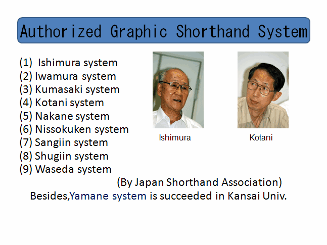 Everyonefs Shorthand Project nominated 9 systems as JSA certified systems about 2 years ago by Chair Kotani in 2008.