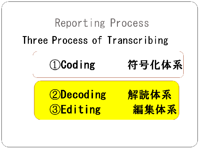 Shorthand is a general term of the activities, which translate an oral expression into a literal expression. Modern Shorthand systems are based on Phonetics and applied abbreviation and Ideograms. Letfs look at Shorthand process. A Shorthand reporter writes down speech by his or her skill, and then he or she transcribes and produces Official Verbatim Record as the Authority. ISO Standard defines record keeping. And, I believe, producing Official Spoken Record should be processed by the World Standard too. The flows of record producing are consisted of technology of Coding, Decoding and editing skill. Practically, reporter concurrently performs Decoding and editing process. |