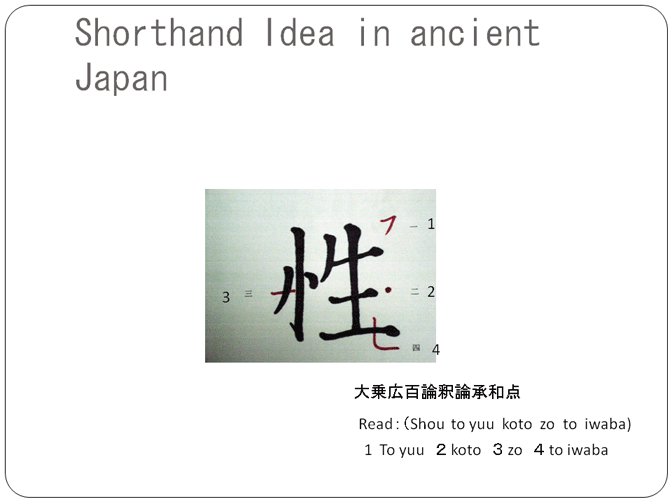 Wokoto dot is a system that converts Chinese into Japanese by dotting around a Chinese Character. In Heian era, Buddhists learned Buddhist scriptures. In those case students took note on Chinese scripture texts hearing Japanese explanation. It is very tough work for students in writing speed. The WOKOTOten, which records meanings in Japanese language on the original Chinese text came from Sanskrit pronunciation, using positions around Chinese Character. A dot means many words, number shows order. This is an idea of hierogriphic shorthand. |