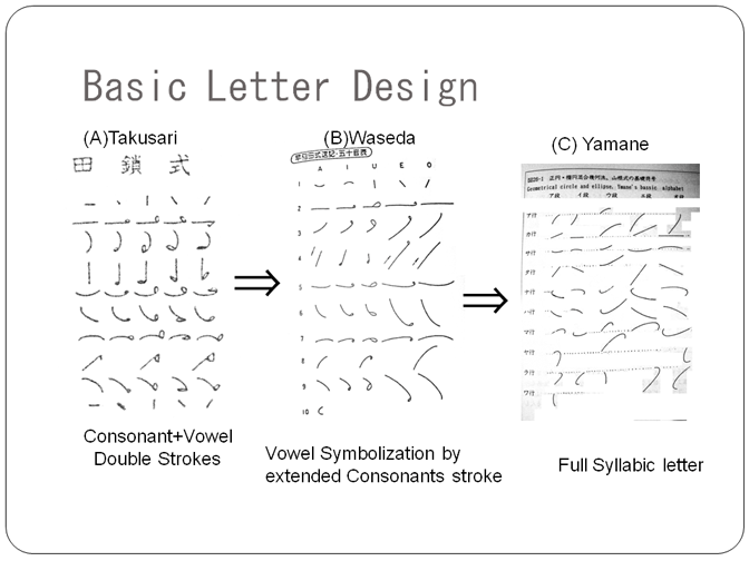 In the first system Takusari accepted Phoneme idea and designed Consonants and Vowel structure. But Japanese has only 5 vowels and is Open syllable language. It is no good idea to write by phoneme. Therefore improvers have been changed Basic letter simple by lengthening strokes or single stroke letters. This strategy of simplification is recognized in China and so on. |
