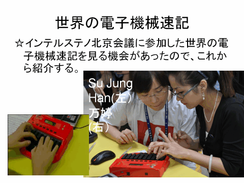 北京会議では、世界の電子機械速記を見る機会がありましたので、これから紹介します。 最初の写真は、中国の速録師と韓国の速記者が仲良く交流する風景です。あとでわかったのですが、中国の速録師は、万テイさん、 韓国の速記者はハン・スジュンさんです。