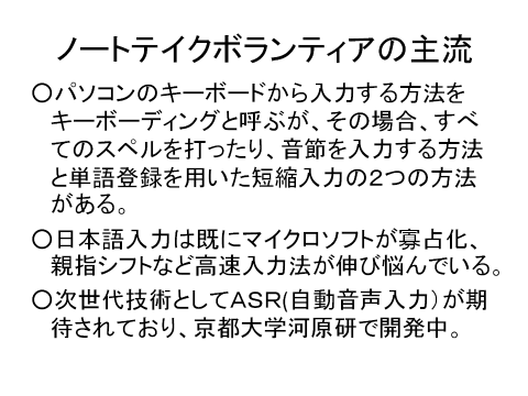 一方、大学のノートテークでは、きょう担当してくださっている同志社大学の皆さんのようにパソコン要約筆記が中心です。