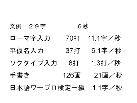 29字の例文をローマ字入力だと6秒間に70打、平仮名入力では37打、私の数え方ですが、手書きは126画、ソクタイプは8打という大変大きな差があると思います。