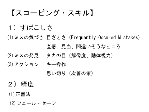 先ほど、しなやかで、すばやいこと、カンがよいことと言いましたが、ミスが発生するのを予見したり、生じたミスの発見、訂正をする作業がスコーピングです。