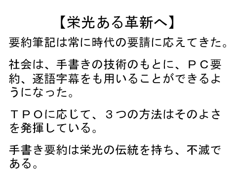 また速記界からは発言全部をありのままにノートテークするというすばらしい字幕サービスが行われるようになりました。その基本となる要素は、すべて手書き要約筆記で蓄えられたものです。