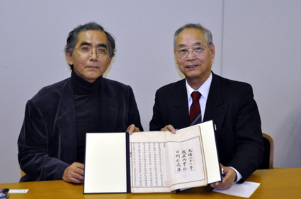 蔡錫勇著「傳音快字」の初版、原本を開く関係者 (左:内田慶一関西大学教授、右:兼子次生関西サイエンス・フォーラム事務局長) 〔関西大学総合図書館蔵〕