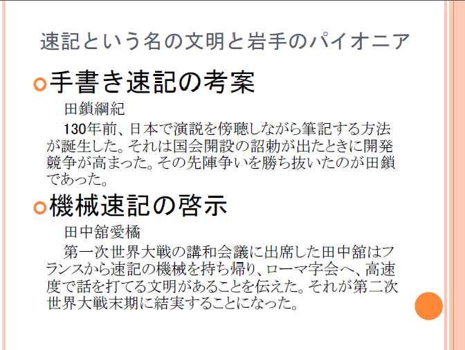 初めに、「田鎖綱紀」によって、130年前、日本で演説を傍聴しながら筆記する 方法が誕生しました。国会開設の詔勅が出たときに速記の開発競争が高まった。 その先陣争いを勝ち抜いたのが田鎖でした。