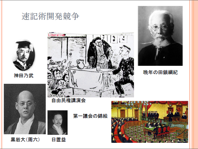 明治維新後、民撰議院の設置を要求する自由民権運動が盛んでした。 明治政府は北海道を開発するため北海道開拓使の制度を設けて、1867年7月から1 882年2月まで4年余の期間に1,400万円を投資して、船舶、倉庫、ビール工場、砂 糖工場、農園、炭坑などを整備しました。それらを五代友厚の関西貿易社へ38万 円という、ただ同然の対価で、無利子、30年賦の条件で払い下げる計画を立てて 天皇の勅裁を得たのです。東京横浜毎日新聞がこれを報道し、政府を批判しまし た。さきに船舶払い下げを申請した三菱の岩崎弥太郎には願いを却下していたこ とがあり、世論は厳しく糾弾しました。政府は御前会議を開いて払い下げを中止 し、伊藤博文首相は払い下げ規則を作成した大隈重信大蔵卿を免官、翌日の1881 年10月12日に、1890年をもって国会を開設することについて勅裁を得たのです。 明治14年の政変と呼ばれる事件でした。 ローマ字による文字改革を掲げる勢力では、ジャーナリストの黒岩大(1862.11. 20〜1920.10.6)が、のちに外交官となる日置益(ひおき・えき、1861.12.21〜1 926.10.22) の訳補、またのちに東京高等商業学校教授になった神田乃武(かんだ・ないぶ、 1857.2.27〜1923.12.30)の校訂を得て「議事演説討論傍聴筆記新法」の版権を1 882年9月16日に免許されました。神田はローマ字運動家でした。「新法」と称し たことは田鎖の存在を意識していたものと言えます。 一方、田鎖綱紀は、初め音をあらわす記号と言葉をあらわす略語記号を考案しま したが、 一転して単音記号と複音符号からなる表音記号体系に変えていました。黒岩の出 版免許が下りた3日後、田鎖の「日本傍聴記録法」は福沢諭吉の時事新報に創案 が宣言されたのです。そして10月28日、最初の講習会開催へと進んでいきます。 田鎖の教え子に若林玵蔵、林茂淳らの逸材がいて、彼らの努力によって田 鎖の案は実用化されていくことになります。 |