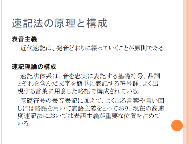 次の段階では、正しい綴りに基づいて書き綴っていく正書法的という概念が速記 の原則とされました。 第三段階で、登場するのは表音的という概念を原則とする近代速記理論でした。
