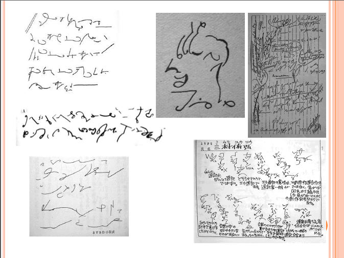 右上の符号は、有名な経済学者のシュンペーターが著書「資本主義、社会主義、 民主主義」を書く際に、執筆構想を練るために書いたメモですが、草書派と呼ば れるドイツ語の速記符号がふんだんに書かれています。