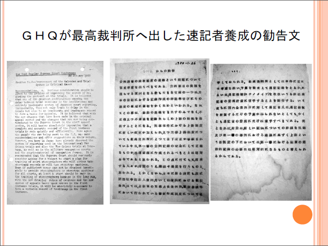 連合国側は、アメリカから機械速記者をつれてきて、法廷での発言を速記しまし た。 アメリカ側の速記録は翌日には完成しているのですが、日本側の速記録は大変日 にちがかかり、なかなかできません。そのためGHQ、連合国司令部は日本の最 高裁判所長官へ、お金がなくても、すみやかに速記者を養成するべきだと勧告し ました。 これが促進剤となって、最高裁判所は調査し、速記機械の特許をとっていた川上 晃を見つけ出し、裁判所で機械速記を実用化していくことになります。 |