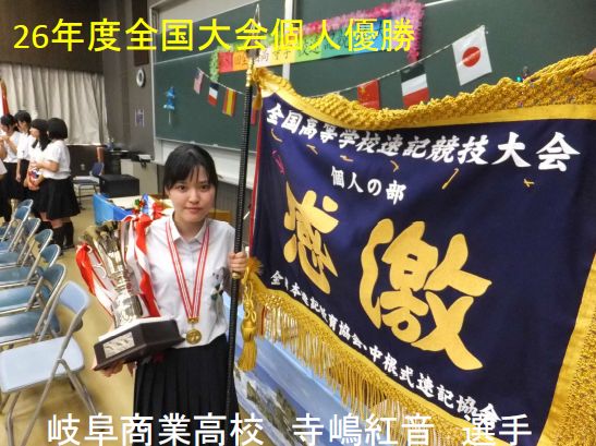 この写真は、午前中に中根康雄さんからご紹介があったかと思いますけれども、 今年の8月の上旬に東京で行われました中根式の高等学校の全国大会の個人優勝した選手、寺嶋紅音さん。岐阜商業の速記部の方です。