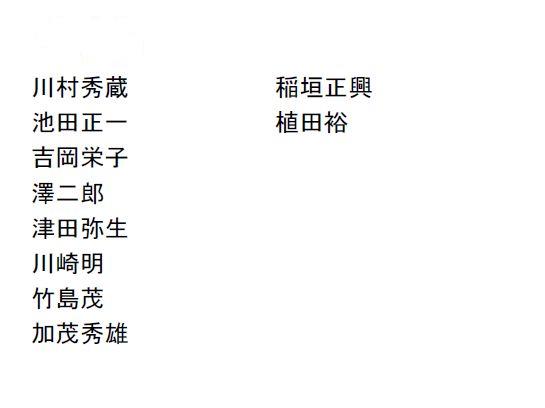 川村秀蔵さん。この方は、東北青森を中心に、東北で多くの中根の速記者を高校のクラブ活動の生徒、それからお弟子さんを育てた方です。![]() 池田正一さんは、中根式速記協会副会長や、日本速記協会の理事長もされた非常に中根式で活躍された方でございます。 吉岡栄子さん、澤二郎さん、津田弥生さん。この3人は、中根速記学校を卒業して、中根式の速記をしながら速記の会社を作られたビジネスマンの成功者です。 残念ですが、吉岡さん、澤二郎さんはお亡くなりになりました。津田弥生さんはご存命です。 そして、川崎明さん、竹島茂さん。このお二人は、東京大学ご出身で、川崎明さんは大学で学んでいるときに、速記をしながら稼いで学者になったという方でございました。 竹島さんは、ジャーナリスト・論客と申しますか、野にあって、いろんな執筆活動をされた方で、『舞台裏の現代史』という書籍が非常に有名でございます。 その他、加茂秀雄さん。この方も、東北の方で後進を育成された方です。稲垣正興さん、植田裕さん。このお二人は同じような時代に高校の速記部を指導されて非常に大きな業績をおあげになりました。 植田さんについては、菅原さんから詳しく説明があるかと思います。