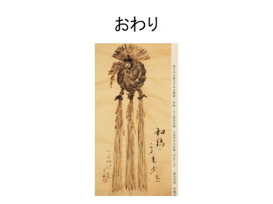 これ、最後の絵は実は、義理の母が今年文部科学大臣賞、和歌と俳画と書の部門でいただきまして、京都で6月ごろ展覧会がありましたので、 個人的なことでありますけれども最後の笠標にご紹介させていただきました。以上でございます。