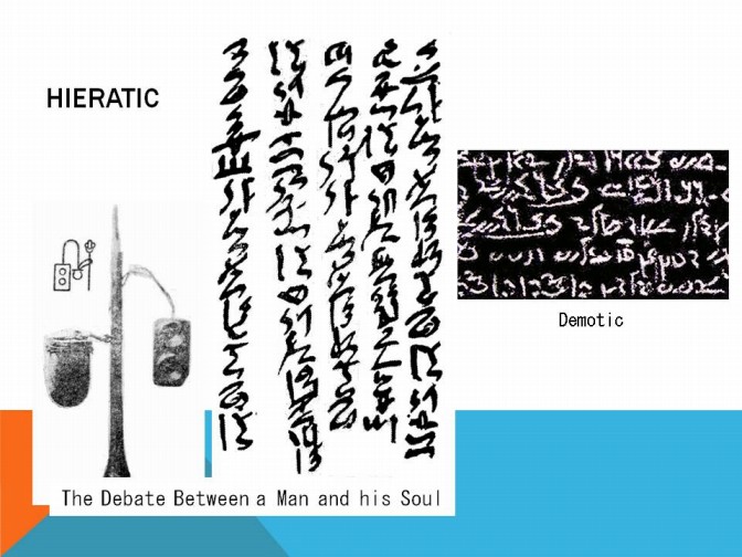 エジプトのヒエログリフは、ヒエラティック、デモティックへと多様化していきました。そこに、文字の速記化現象があります。