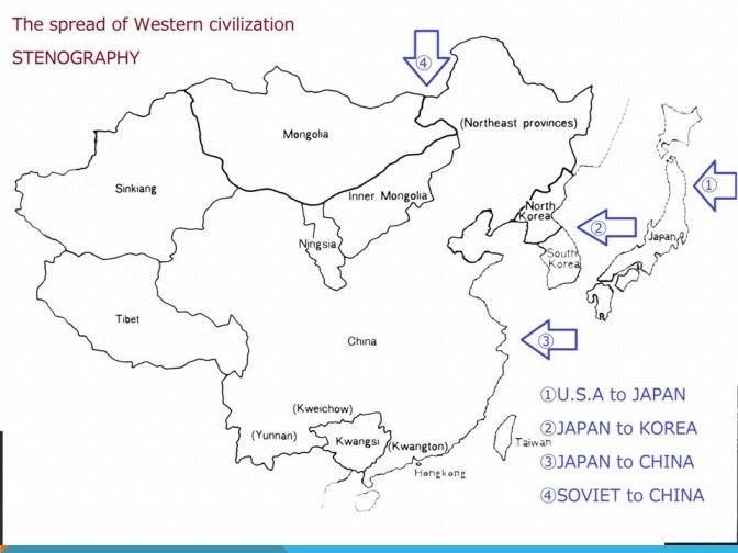 On the other hand, German Cursive system was introduced to Japan by Viscount Takanori Mohri, and he developed Japanese cursive system in 1920. In China Cursive system came from Germany through Soviet after World War Two.