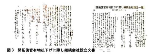 2.速記のカタパルト〜開拓使官有物事件の誤報〜 この一連の出来事から始まる「十四年の政変」がその後の政治に大きな影響を与えるが、きっかけとなった払い下げ事件の暴露報道が、 末岡照啓(住友史料館研究顧問)、八木孝昌(大阪市立大学同窓会五代委員会委員)の研究から、事実無根であることを示す文書が相次いで発見されて、五代の汚名をすすぐことに成功した。 大誤報は、東京横浜毎日新聞「関西貿易商会の近況」の社説。7月30日勅裁を得て8月1日に発表された開拓使官有物払い下げ案件は、 7月26日に黒田清隆開拓使長官が同郷の五代友厚総監の関西貿易商会へ対価38万円、無利子、30年賦で払い下げるとすっぱ抜いた。 物件はビール工場、砂糖工場、炭鉱、農園など1,400万円に上る資金を投じて開発した資産。以前に船舶の払い下げを申請した土佐の岩崎弥太郎は却下されていて、政商五代の癒着事件だと騒がれた。