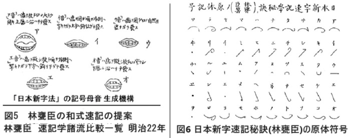 5−1.速記理論の特徴と反訳面の研究 日本語においては漢字の書字習慣が前提にあるものの、輸入文化の速記ではイギリスのピットマン式の影響を受けて成立しており、 文字改革運動の影響を受けて、欧米方式を受け入れる立場や、神代文字を参考にした速記の提案を初めローマ字運動の関連でローマ字式、一方かな文字式や片仮名のカナ式などへ広がった。 初期に速記を日本語へ移植する試みは、まず英文速記方式の音素符号を日本語の音節符号へ翻案する方法で企てられた。例えば「K」を「カ行」へ、「S」を「サ行」のように当てはめられた。 つまり、合理的根拠なく母式の子音が基本的に子式へ移植されることが多く、速記符号は恣意的な配分の産物であった。国学者、林甕臣は神代文字の母音発声機構の解釈を用いた速記符号を提案したが、 実用に至らず例外的存在であった。