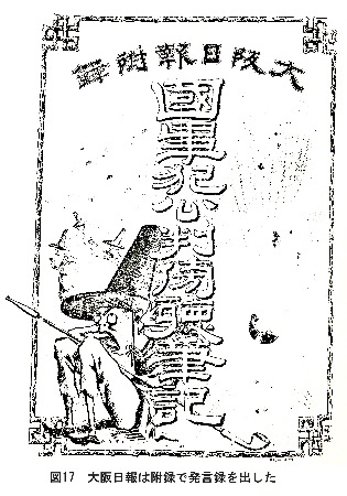 一方、綱紀に速記を学び、明治21(1888)年発表のグレッグ式の淡線理論と通じる「淡線記音学」を公にした、藤木顕道† (*8) が、綱紀の関西における活動を支えた可能性があると兼子は見る。幼い"一"は「父は母や丸山平次郎、山田都一郎その他の門下生を率いて、その事務に当り、毎日の新聞を大裁判の記録で賑わしたと聞いている」と懐古談に書いたが、事実は異なる。 ちなみに、丸山は綱紀の口述を速記し、田鎖式の方式書を執筆した「言葉の写真法」(図14)は大阪でベストセラーになったが、大阪事件では朝日新聞の依頼を受けて、綱紀らと競う関係であった。法廷での前哨戦を師が闘って、速記の国会採用は真打ち若林玵蔵の成功という構図となる。 後藤孝夫は『「すでに実行化の段階に入っていたと見られる明治20年前後」でも、速記はまだまだ失敗が多かった。』と竹島茂(「舞台裏の現代史―速記の100年」説を引くが、1887年当時、学習者は多くなく、逐語速記録を作成できる速記者は少なかったであろう。
