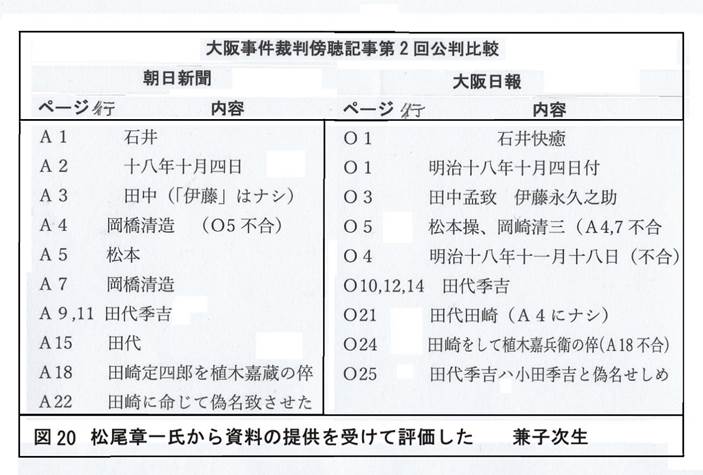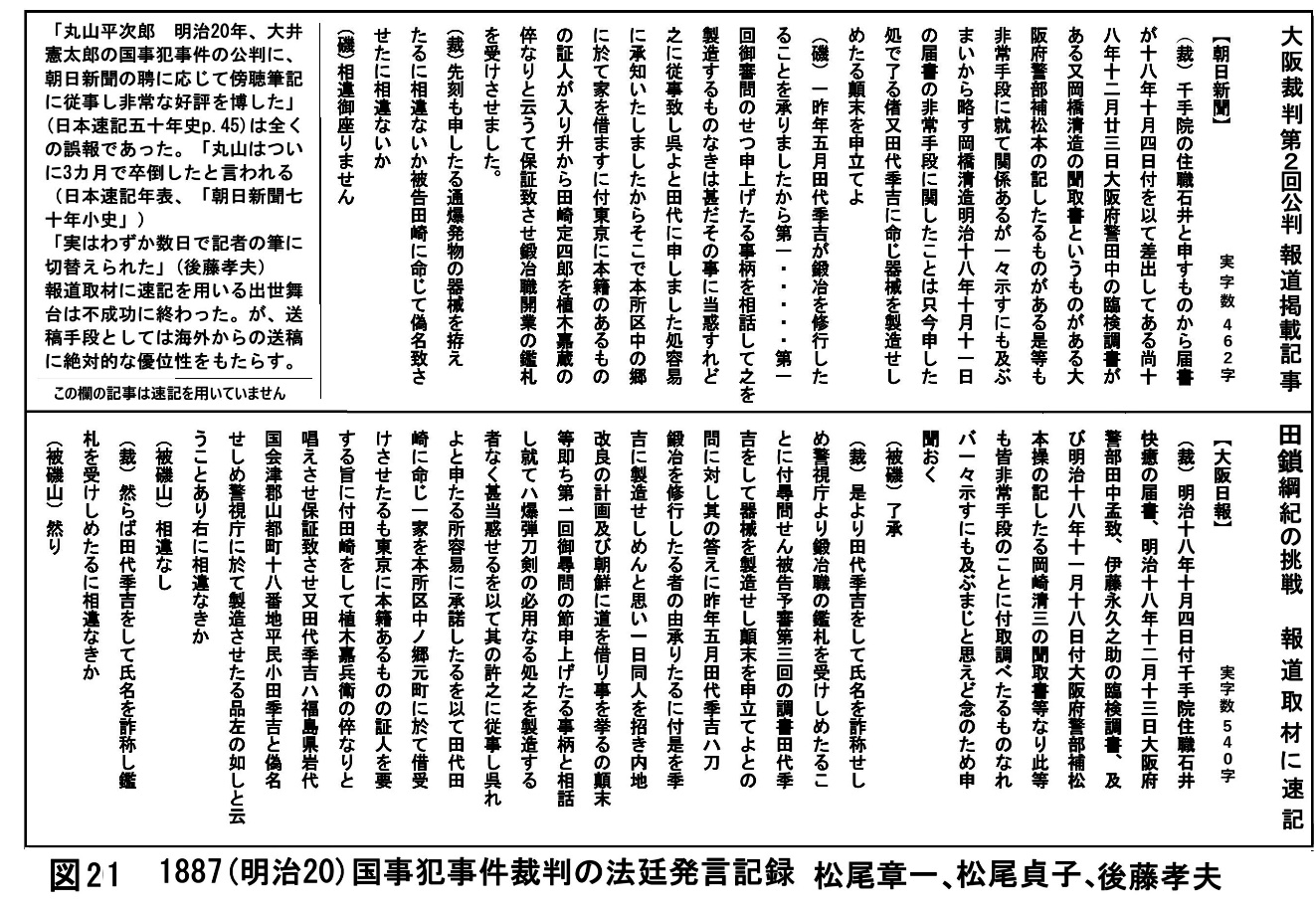 兼子が昭和40(1965)年末、兵庫県城之崎で体験した関西電力労組の大会では、公式の逐語速記録を作成するチームと、その夜の役員会資料とする速報版の要約発言録を作成する2チームを用意して、後者の作業は普通文字で要約させた。田鎖綱紀夫妻、藤木が従事した作業形態が、発言者ごとに普通文字で筆記してバトンタッチする後者の作業形態であれば、現場キャップの記者が原稿に仕上げながら本社デスクへ提出できるので締め切りに間に合わせることができるはずなので、大阪日報はそのような作業形態をとったのかもしれない。 大阪日報では記事を記者が執筆した可能性があり、田鎖綱紀チームは普通の文字で走り書きして記者に渡す執筆分担をとったらしい。田鎖、丸山は大阪事件の速記作業についてその後発言することがなく、幼児の遠い思い出が残るだけである。兼子が第三代、源一から聞いた話で「田鎖家では速記の実務は妻、弟子が行い、当主は研究、訓練などを行ってきた」ことを勘案すると、綱紀の妻の基と優秀な弟子が書いたことは間違いなく、田鎖綱紀がどの程度書いたかは不明である。 一方、取材記者、デスクは発言ありのままの記事よりも、着目するニュース・ポイントを浮き上がらせるように執筆し、編集拠点で見出し付け、割り付けを行うものである。これらを考慮すると、紙によって報道の揺れが生じることは正常な記事編集の範囲にあることを意味する。それに対して、裁判所の書記が職務として作成する正式記録「公判始末書」が公証権 を持つ発言記録で信頼性があるので後藤、松尾章一ら大阪事件研究者は公開を期待してきたが、いまだ発見されていない。廃棄処分されたのかもしれない。 図21は、6月4日の第2回公判の発言記事(松尾章一提供)で、上段に朝日新聞(一行20字×26行:文字実数462字)、下段に大阪日報(同×33行:660字)二紙の記事比較で、冒頭から爆発物製造の事実関係を審問した部分の部分である。本論では、速記作業の立場から記事を比較することにしたい。