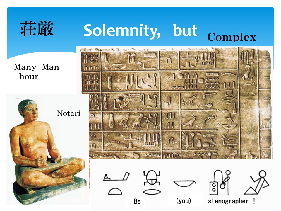 Ancient times, Mankind invented Hieroglyph. After spoken language invented, humankind had letter and character in several cultures. Letter and character have two values. One is the symbol of the Power, and another is for practical use. As the symbol of the Power, Hieroglyph in Egypt and Character in China changed gradually into complex style. |