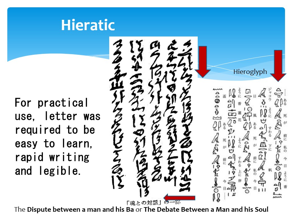 Slowly ,Hieroglyph was changing into flowing style. On the other hand, requirement for practical use, Hieroglyphic and Demotic in Egypt , Chinese cursive script, Hiragana and Katakana phonetic syllabic letters in Japanese and Hangul in Korea were developed. A desire to write fast is observed in script of Latin alphabet too. |