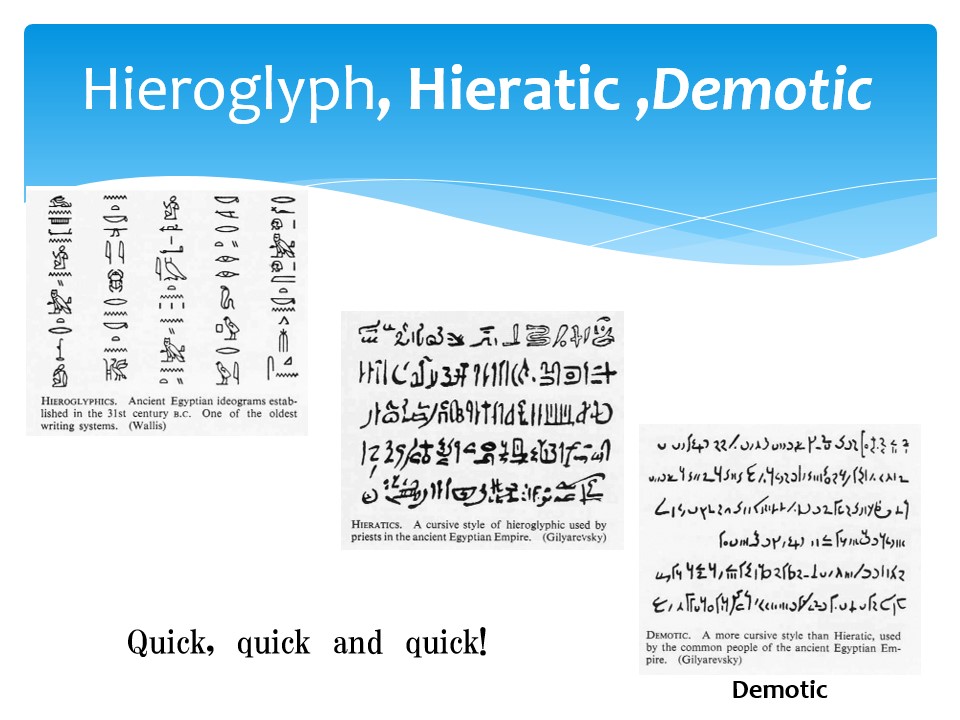 Hieratic and Demotic were gradually derived form from Hieroglyph.