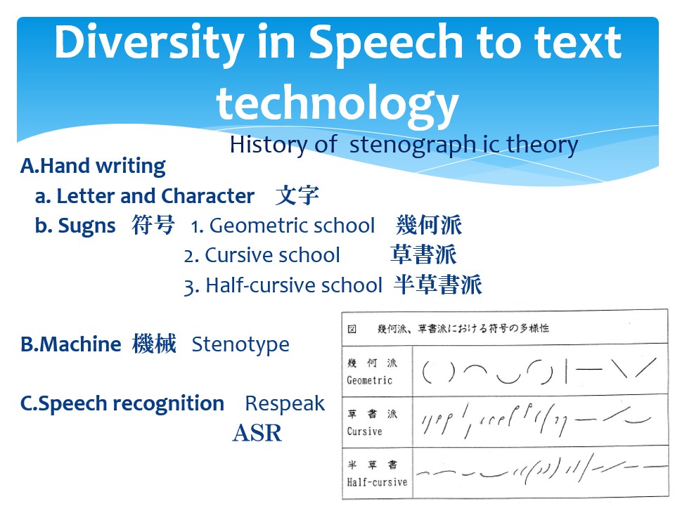Stenography is defined as one of “speech to text method” under the comprehensive concept of letter and character. Today, we have many methods to transcribe speech. Traditional method is ( A ) Hand writing called stenography. This concept means man operates speech capturing process at attendance ,then man transcribes it . I think that the former is upstream process and the latter is the down stream process. Historically stenography adopted Line strokes for basic alphabet. There are three ideas to symbolize sounds. First, Geometric school adopted geometrical figure to phoneme, Consonants on phonetic principle. Second, Cursive school adopted a part of longhand cursive style for basic alphabet on phonetic principle. Third, mixed advantages of two schools ,called Half-cursive school. It seems to be improved disadvantage of Geometric school. Also it is based on phonetic principle. The other methods, ( B ) Machine stenography called stenotype , ( C ) Speech recognition; respeak , and ASR, automatic speech recognition and so on. |