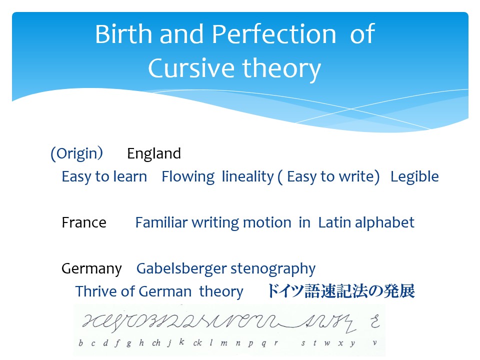 Cursive school has its origin in England.Smooth writing idea was developed in France. Vowels are symbolized by connected small signs . Geometric theory has achieved high performance to code word-spelling. But challengers to write naturally aimed cursive theory. German completed cursive theory after all. |