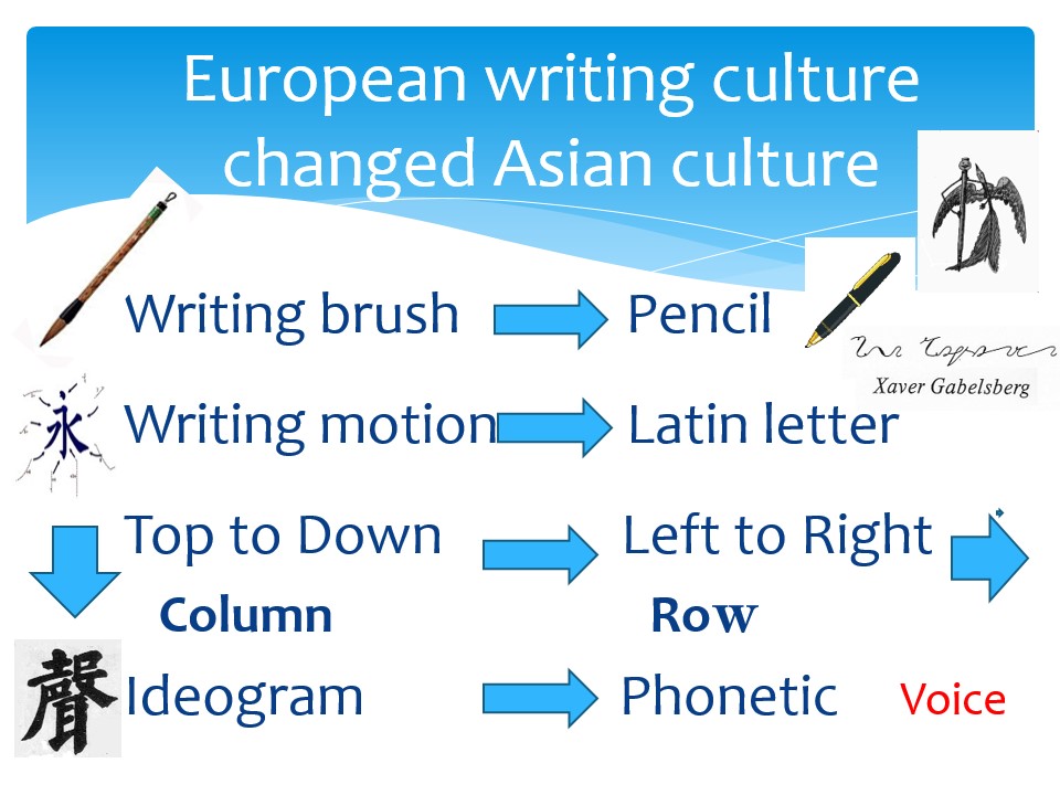 Western stenographic civilization gave much impact to Asia ; Pen, Writing motion, Writing order,Concept of phonetics and so on. In Asia, our ancestor used writing brush in writing Chinse character on hand made Japanese paper which absorb water much. Character is ideogram. It is very different from Latin alphabet. Chinese, Japanese write Chinese character which has meaning and pronunciation. But pronunciation varies among each languages. Even in the same language, the pronunciation is not one. Moreover, one character in Japanese has plural pronunciations. Traditional writing direction was Up to down right to left though,today, we write as European from left to right direction. Today we use phonetic letter for writing a loan-word. |