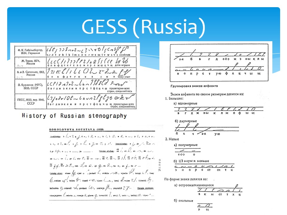 GESS was the unified system in Soviet. As DEK was based on Gabelsberger , GESS was developed on the basis of Sokolov system.