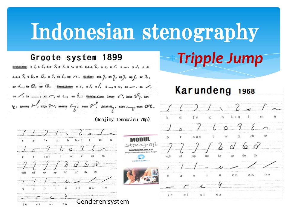 While Colonial period, Groote system was introduced to Indonesia. It stimulated to develop stenography for Indonesian.