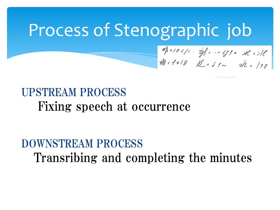X Traditional stenographic work has been formed in Two processes. We are writing stenography attending floor and courtroom. Conventionally, we stenographer make transcription at our desk . This old type of stenographic work model consists of two skills. CAT is a technology to automation in second process. CART is more automatic technology for communication aid. Respeaking: Speech Recognition is alternative method for First process. Automatic Speech Recognition ASR technology offers whole automation. But now ASR needs important help by skilled stenographer. |