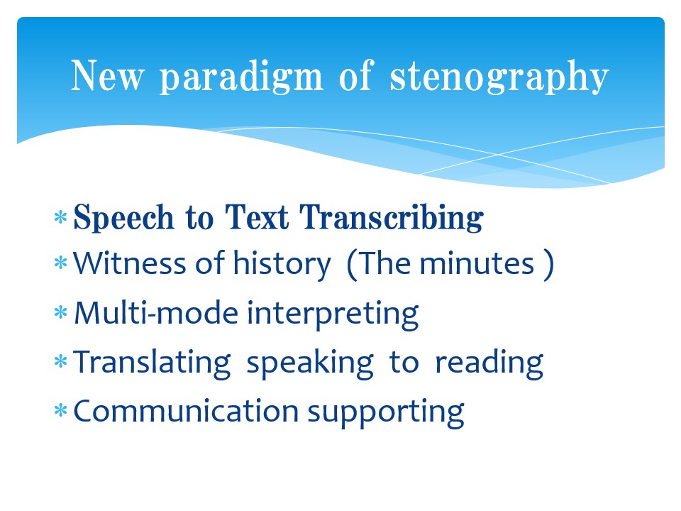 Letter in ancient times has a role to dictation . Stenography made a specialist to be a witness of history. In 20 century, to provide spoken information in an alternative mode established , Hearing mode to visual mode. Hearing impaired can get spoken language in literal media. Now it is communication tool. New service is spreading in the world . |